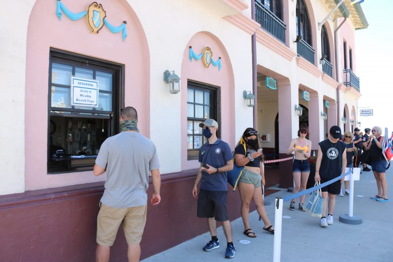 Wearing face coverings, people line up at the Music Pier in June to purchase beach tags.