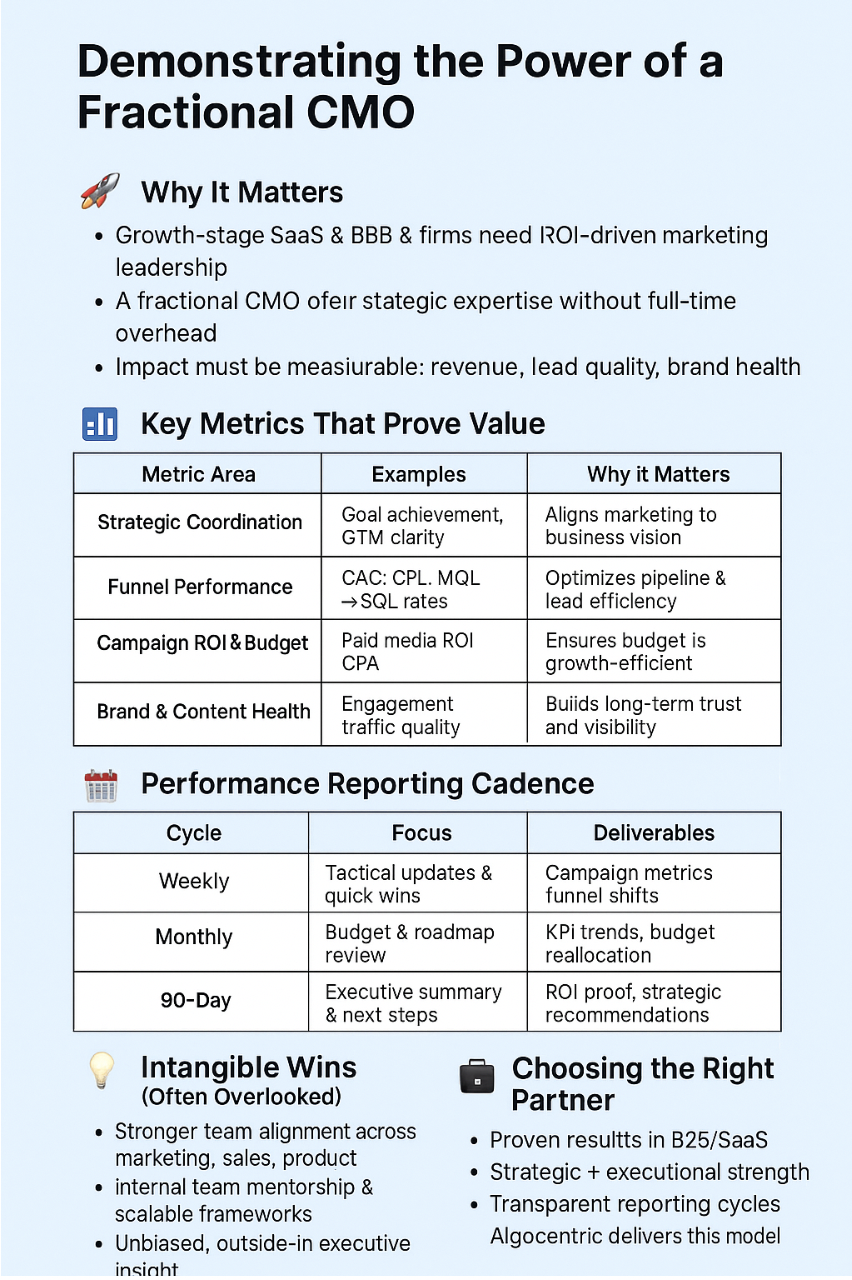 By prioritizing strategic marketing KPIs like funnel performance, campaign ROI, and brand health, businesses can quantify fractional marketing leadership value. Less tangible value-adds like team alignment and mentorship are also key to long-term success. For SaaS and B2B executives who need agile, high-impact solutions, a fractional CMO agency investment is an astute one to achieve growth and deliver results. Discuss how other partners like Algocentric can help design a scalable, predictable marketing engine.