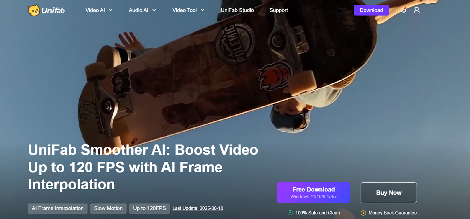 UniFab Smoother AI is an AI-powered video enhancement tool that specializes in frame interpolation — creating new frames between existing ones to make motion smoother when slowing down footage. It also offers denoising, sharpening, and resolution upgrades.