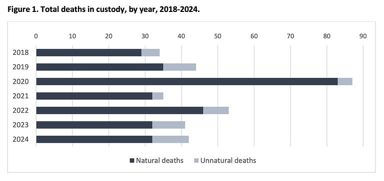 While the number of deaths held fairly steady at an average of 41 per year (excluding a pandemic-related spike in 2020), the prison population fell by a third from more than 19,000 in 2018 to less than13,000 last year, the report notes. That means the overall death rate rose over that time.