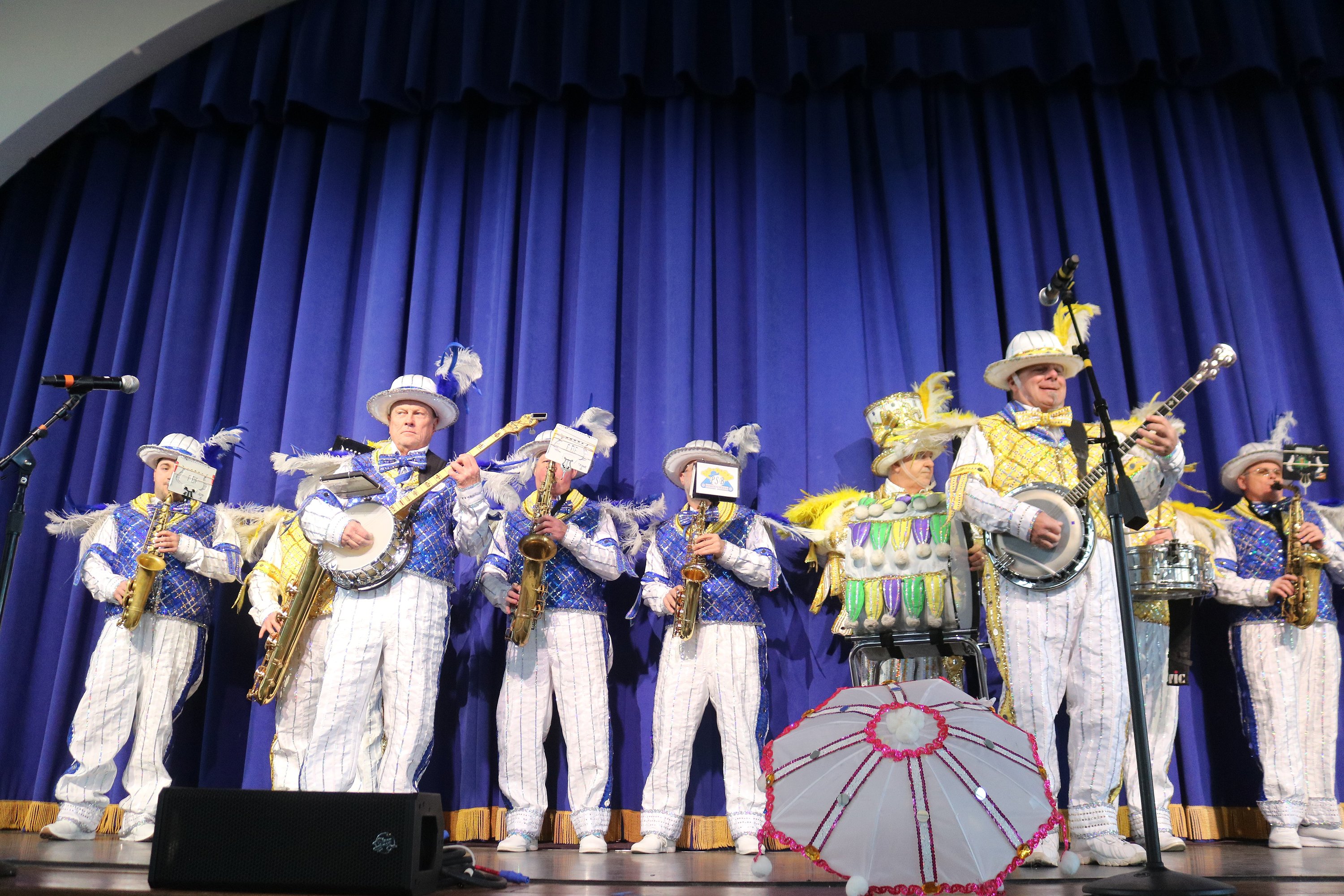 The Mummers-style Pennsport String Band provided a lively musical backdrop for the ribbon-cutting ceremony and then remained on stage at the Music Pier as one of the headliner acts for First Night.