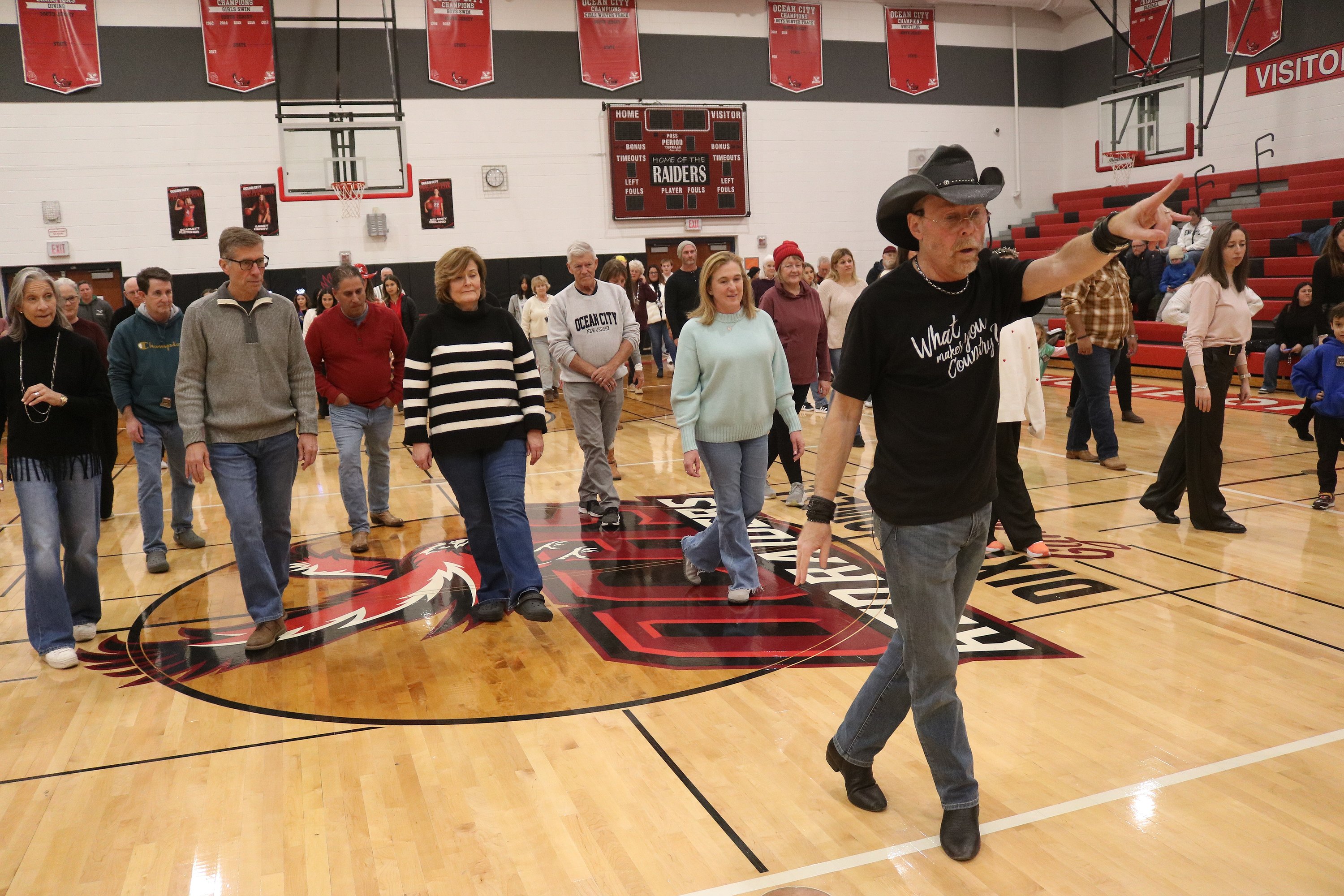 Line dance instructor Rob Holley shows the crowd some moves at the Ocean City High School gym.