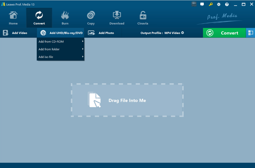 Under “Convert”, choose "Add UHD/Blu-ray/DVD" in the drop-down box. Then you can import the target DVD files into the program.
