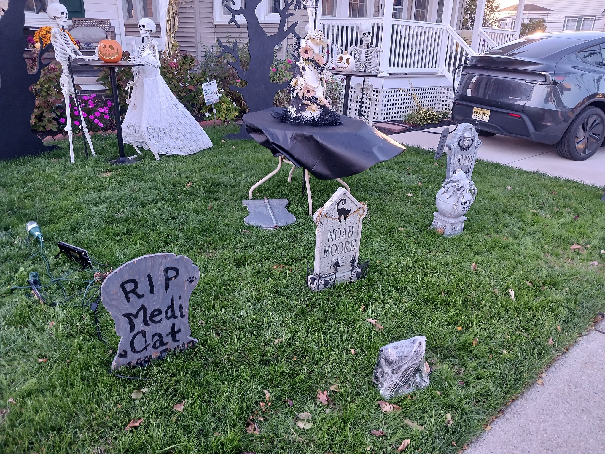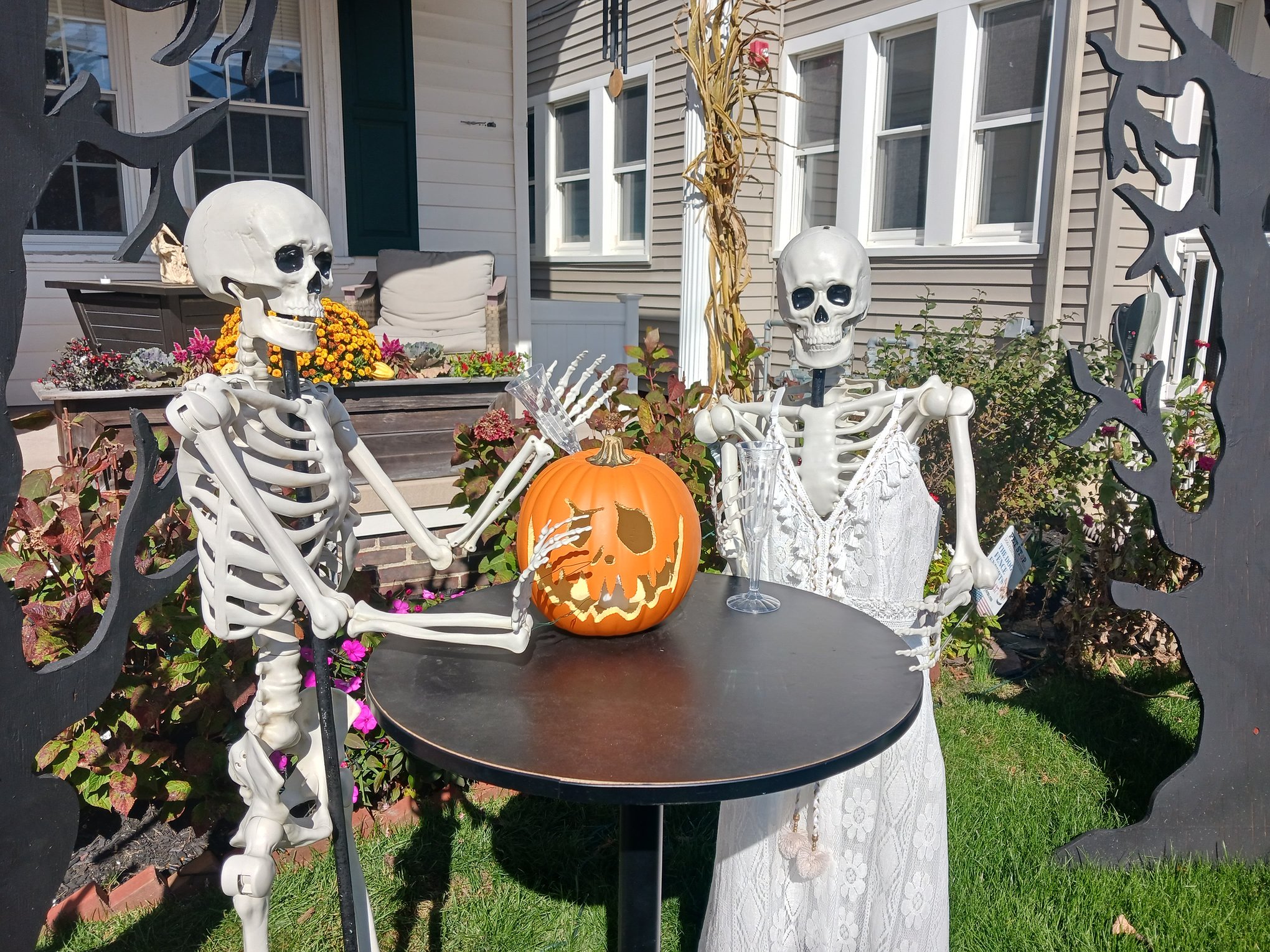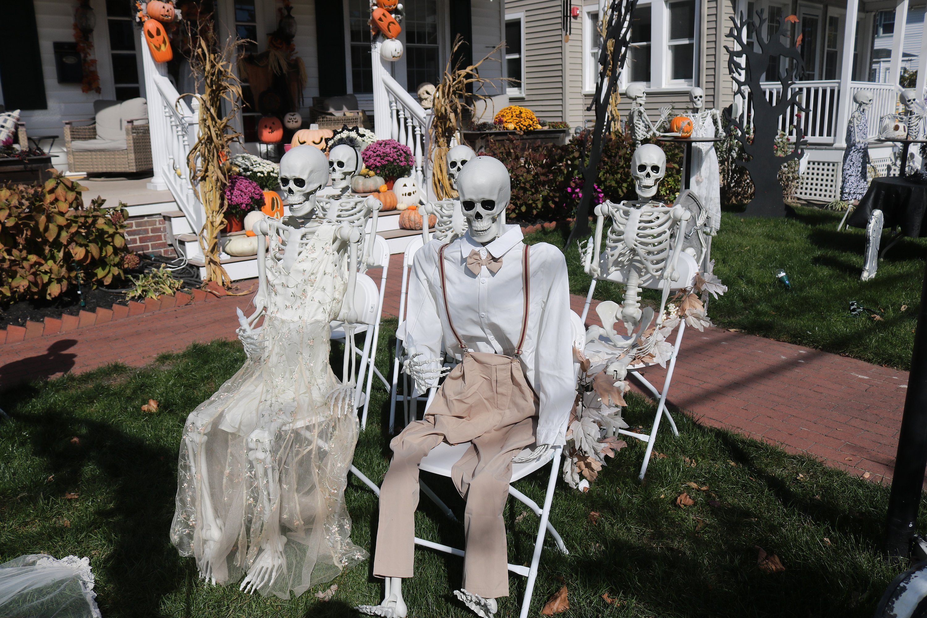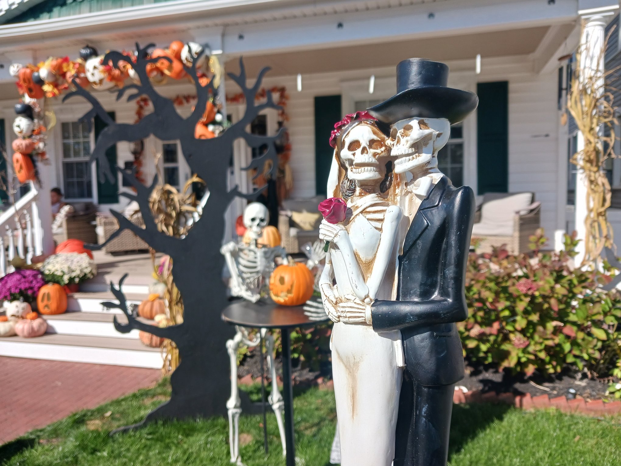 The bride, “Boney,” and groom, “Clyde,” are the focal point of the Halloween decorations. Their names are a whimsical reference to the 1930s gangsters Bonnie and Clyde.