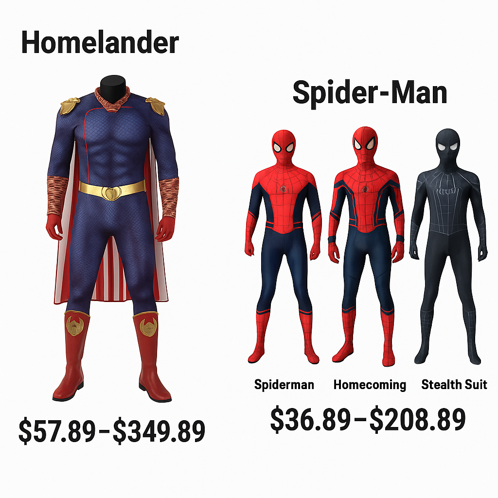 Spider-Man suits are more flexible. Entry-level versions begin at just $36.89, with plenty of choices in the $40–$70 range. Mid-tier options like Homecoming or PS4 suits run around $115–$130, and special editions such as the Far From Home Stealth Suit can reach $208.89. This range makes Spider-Man one of the most versatile cosplay choices—affordable for beginners, yet with premium editions for collectors.