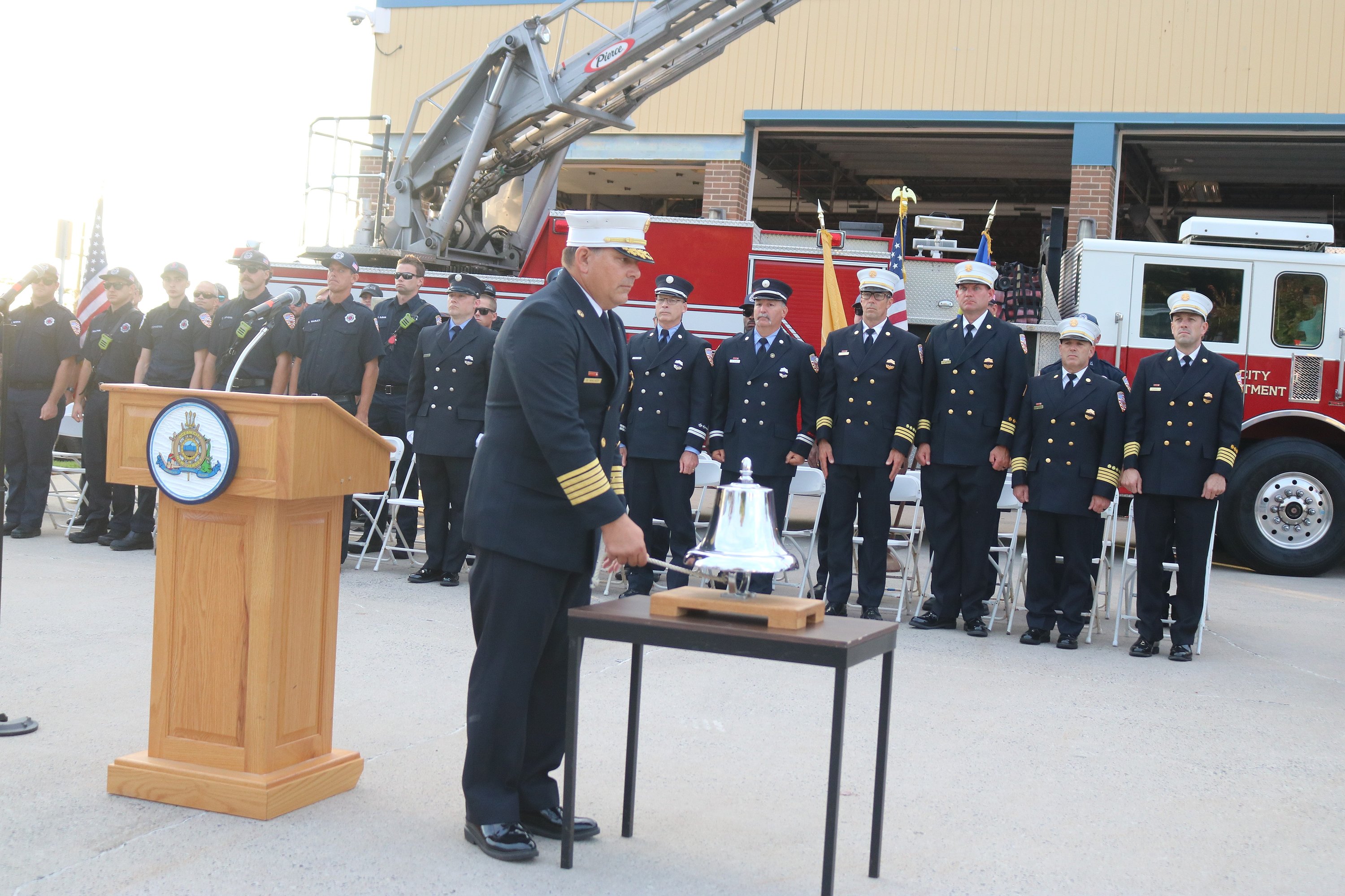 Walker closed out his remarks by tapping a silver bell in front of the fire department to demonstrate the “Striking of the Four Fives,” an old tradition symbolizing the death of a firefighter in the line of duty.