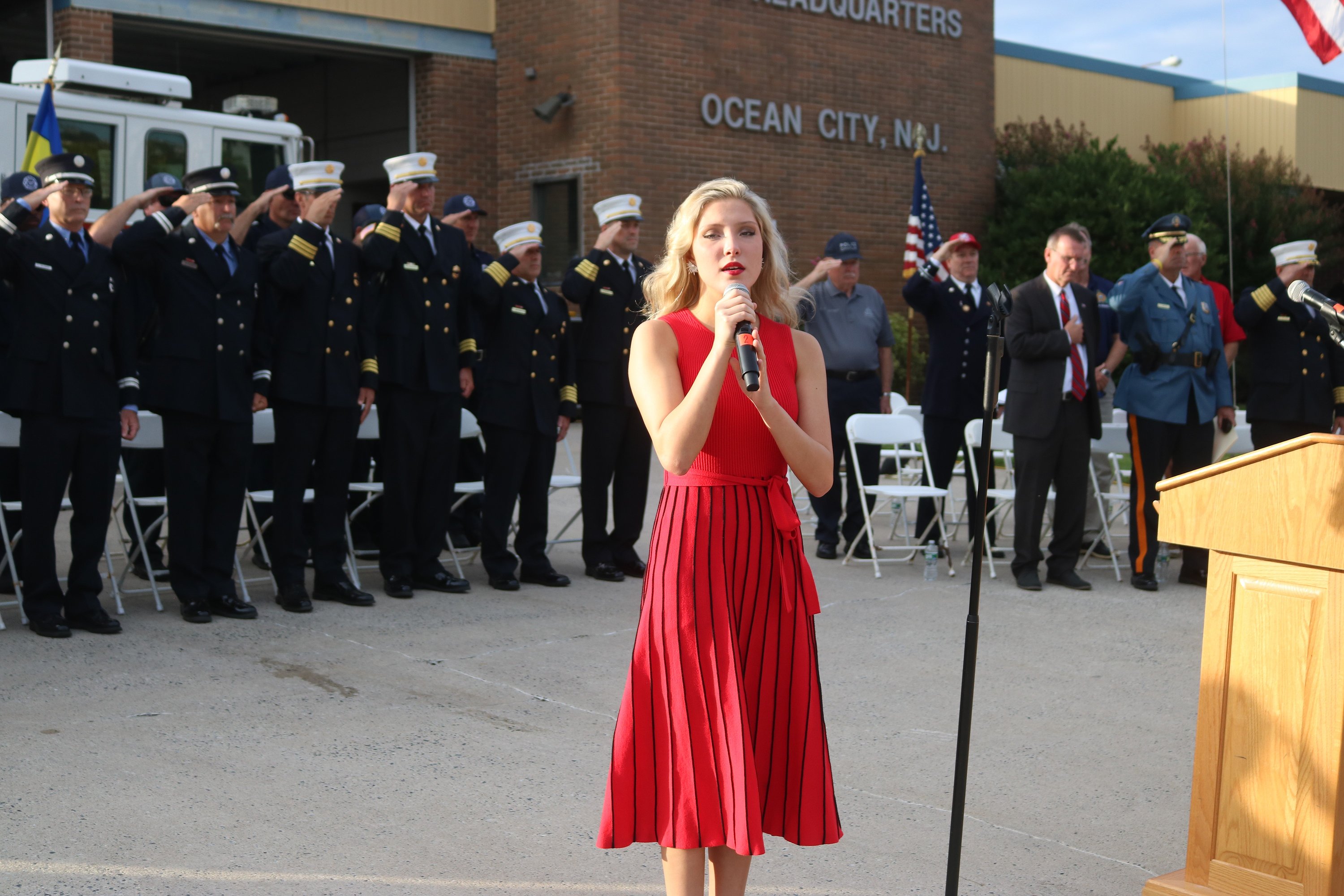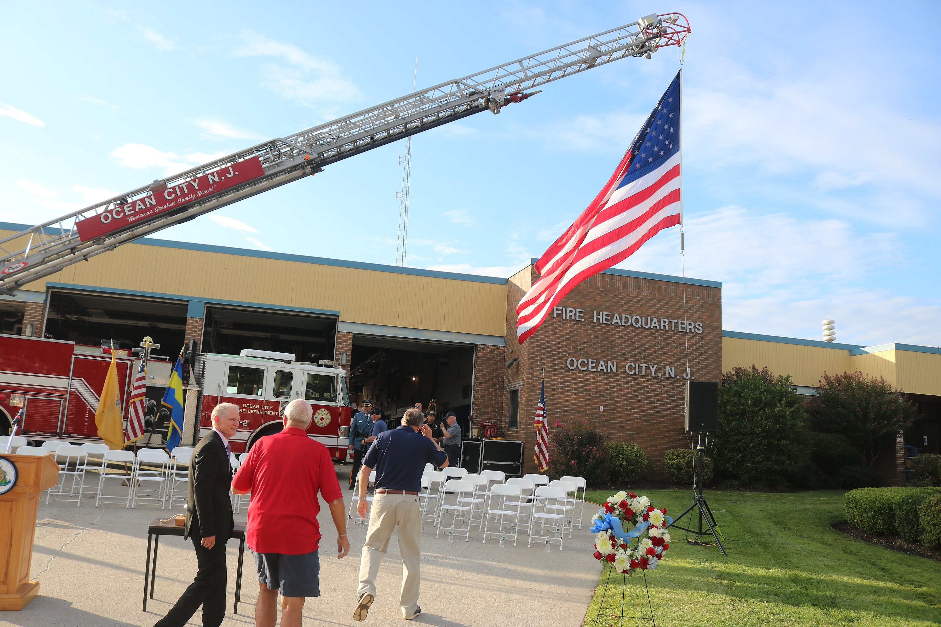 Providing a patriotic backdrop to the ceremony was a giant American flag that hung overheard from the ladder of an Ocean City fire truck.