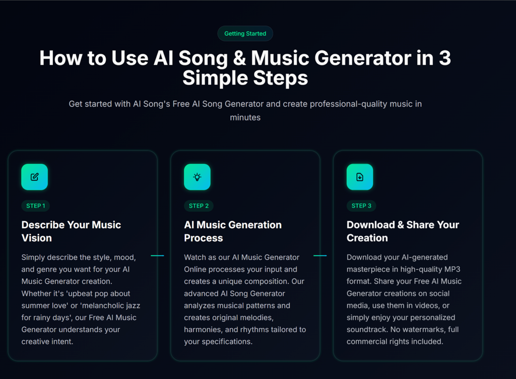 Using AI Song, translate your emotional and practical needs into descriptive language. The more specific your description, the more precisely the AI can match your vision.