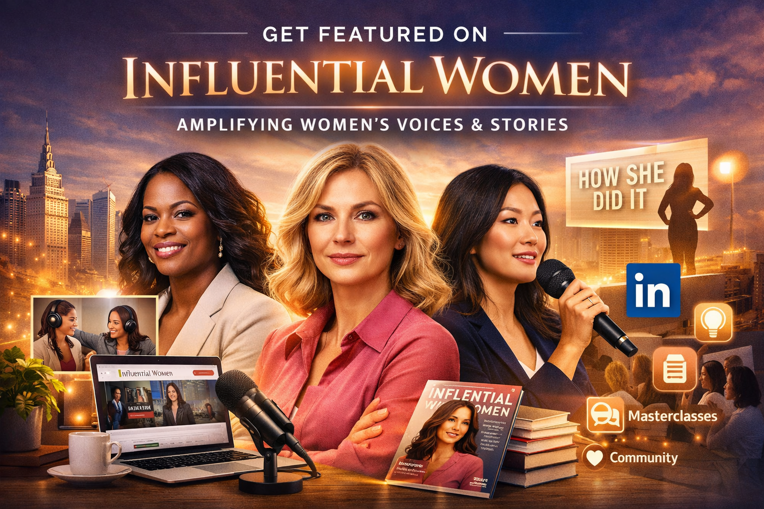Influential Women is a professional media and editorial platform dedicated to highlighting women's leadership across industries. From its official podcast and magazine to its How She Did It story series, masterclasses, and editorial blog, the platform is built around one core belief: women's voices deserve to be heard, celebrated, and amplified.
