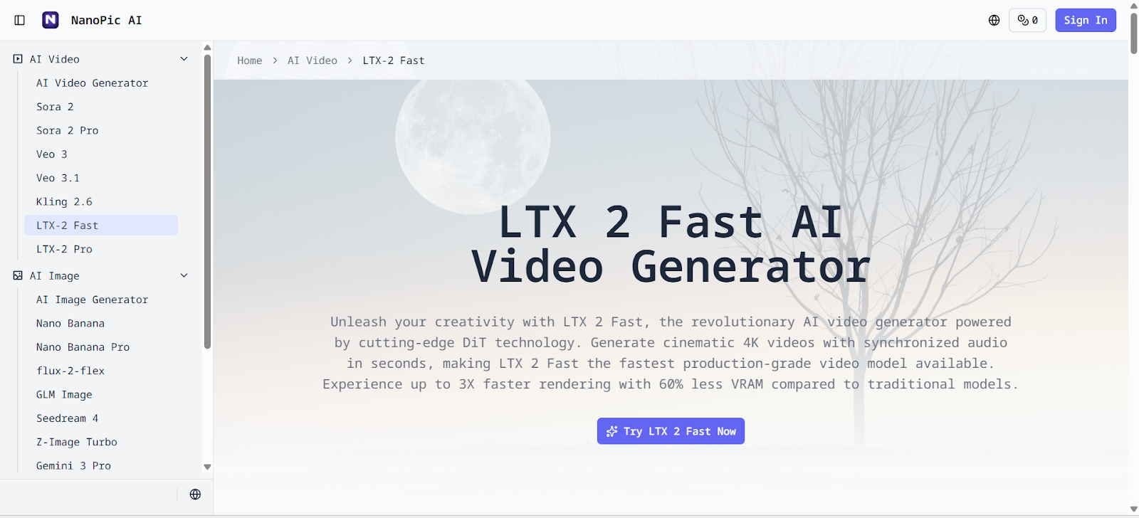 It creates videos from text or images and supports up to 4K resolution and 50 FPS. Audio is synchronized with the video. This solution is available on the nanopic.ai - All-in-One AI Video and Image Generation platform. It is easy and useful for both new and professional users. One of the biggest advantages of ltx-2-fast is that it is available for free on nanopic.ai. Users can generate high-quality AI videos without any subscription, making nanopic.ai a cost-effective all-in-one solution.