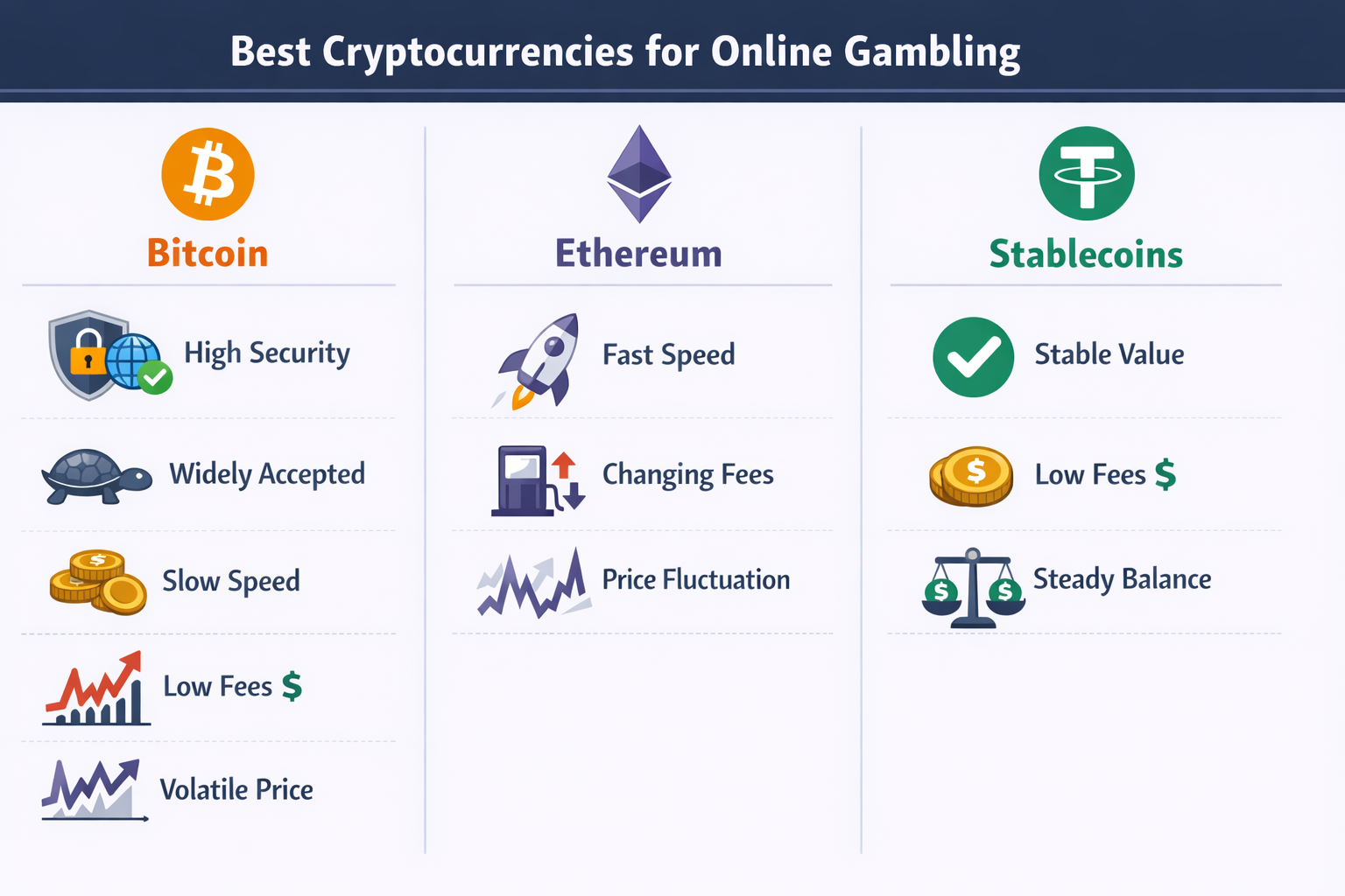 Choosing the right cryptocurrency depends on a player’s priorities, whether that is network stability, speed, or value preservation.