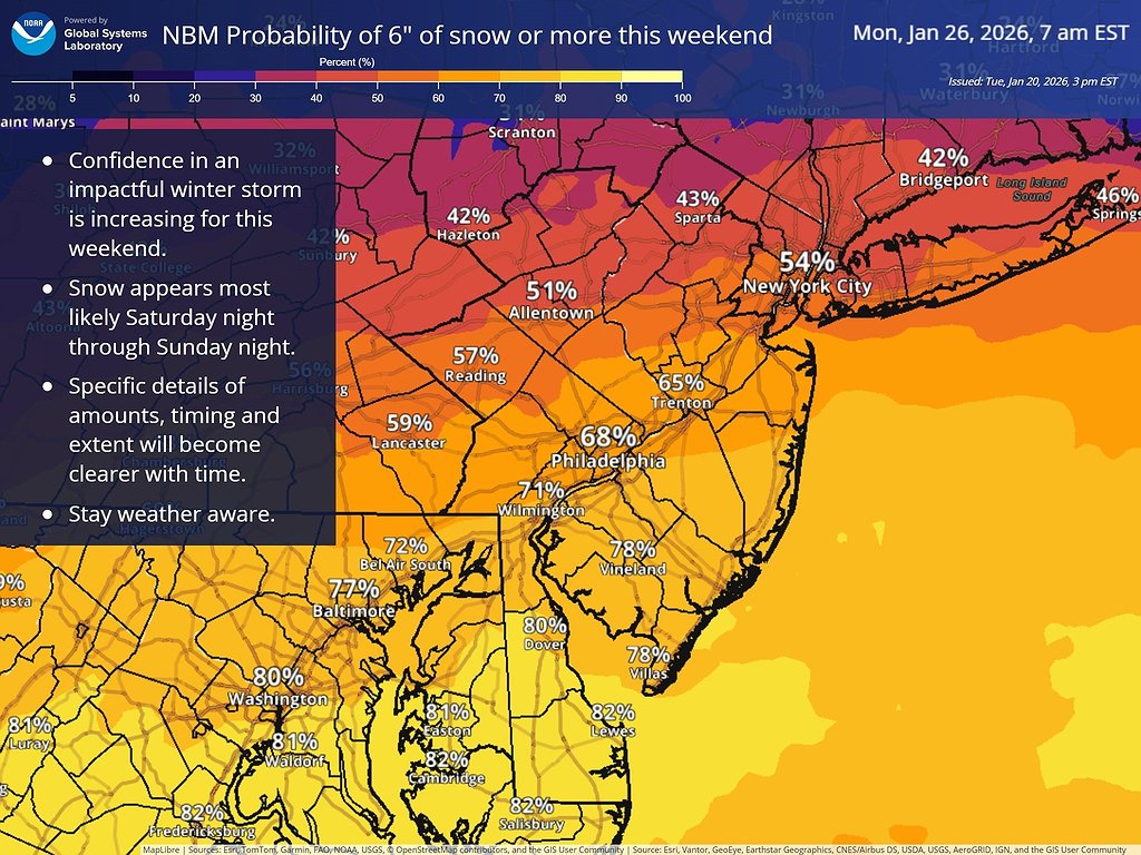 The probability of 6 inches of snow or more in South Jersey this weekend is about 80 percent. (Graphic courtesy of NOAA)