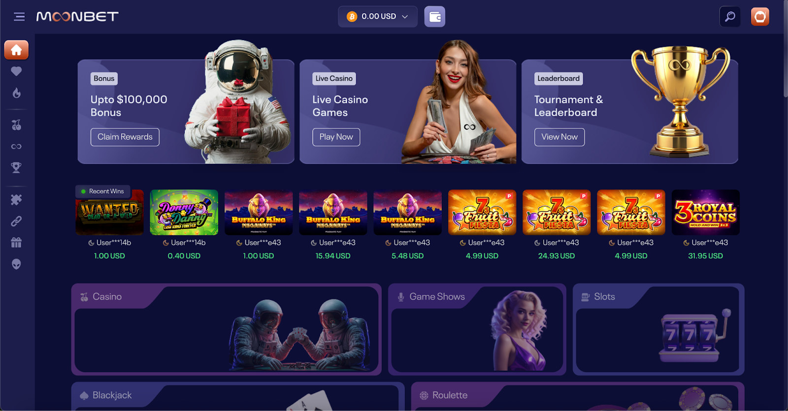 Moonbet suits high-rollers who play extended sessions because the 200% up to 1 BTC bonus unlocks during wagering, allowing high-rollers to get more total bonus value over time. Fast BTC withdrawals (15-35 minutes in testing) and support for higher crypto bet sizes across slots and table games made the platform more practical for volume bettors.