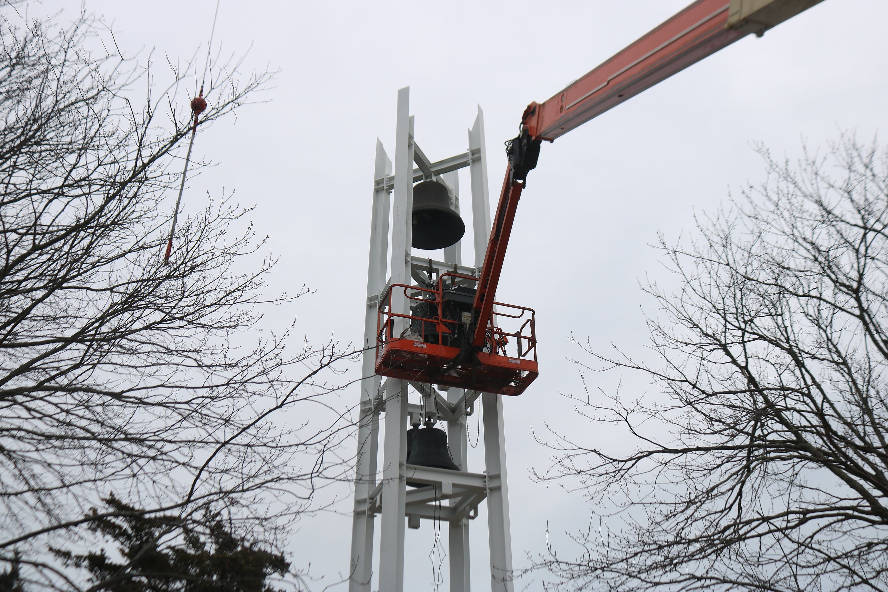 Using two large cranes, crews from the Verdin Bell Co. began carefully removing the bells Wednesday. Once all of the bells are taken down, they will be transported to the company’s headquarters in Cincinnati, Ohio, to restore them back to working condition.